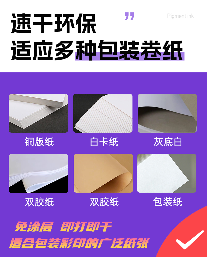 适应介质:铜版纸、白卡纸、牛卡纸等包装印刷常见纸材